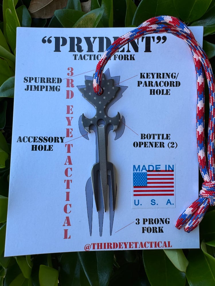 Prydent Tactical Fork with custom Stars N Stripes laser engraving. Cut from titanium for a lightweight bottleopener that not only looks good but is also functional. Comes with red, white and blue colored lanyard, unique Prydent themed stickers, Keyring accessories and bottle cap magnet.