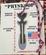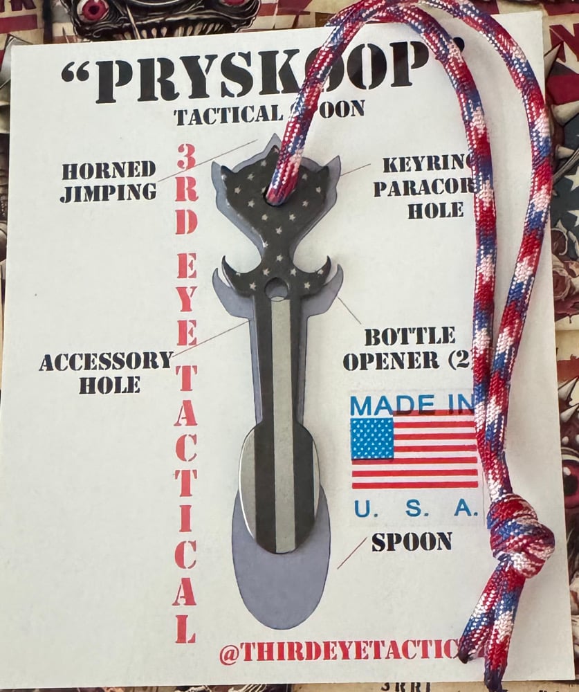Pryskoop Tactical Spoon with custom Stars N Stripes laser engraving. Cut from titanium for a lightweight bottleopener that not only looks good but is also functional. Comes with red, white and blue colored lanyard, unique Pryskoop themed stickers, Keyring accessories and bottle cap magnet.